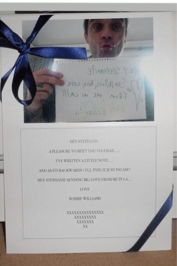 | Robbie sends a message to Stephanie Knight Rehab Fund. https://twitter.com/RWFriendlies/status/304138901717667840 Честно незнаю когда фото сделано)