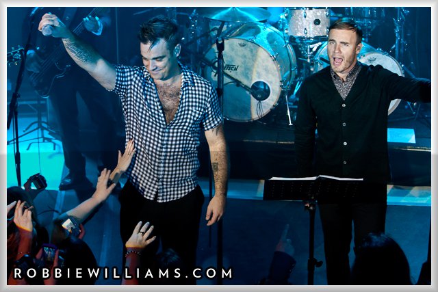 | Gary Barlow made a surprise appearance at a Robbie Williams concert last night (13.10.10), where they performed their duet 'Shame' together. Gary Barlow made a surprise appearance at a Robbie Williams concert last night (13.10.10). The Take That singer joined his bandmate - who has recently rejoined the group after originally quitting in 1995, a year before the boy band split for the first time - onstage to perform their song 'Shame' from Robbie's new greatest hits album. An onlooker at the concert - presented by radio station Magic 105.4 and Barclaycard Unwind - show said: "It was such a surprise, we hardly thought Robbie could pull out any more hits after 'Rock DJ' and 'Angels', then all of a sudden Gary came on and it was amazing to see them both there onstage together, reunited. "I saw the last Take That tour, The Circus, without Robbie, and the atmosphere was amazing, but I think when all five of them appear together again it will be the most incredible show ever, I'll shout so loud I'll probably lose my voice - I can't wait." Robbie's hour long set at the trendy Supperclub venue in London's Notting Hill also included his hits 'Feel', 'No Regrets' and 'Come Undone', among others and was attended by 300 lucky competition winners and VIP guests including Geri Halliwell. http://www.contactmusic.com/news.ns....1173184